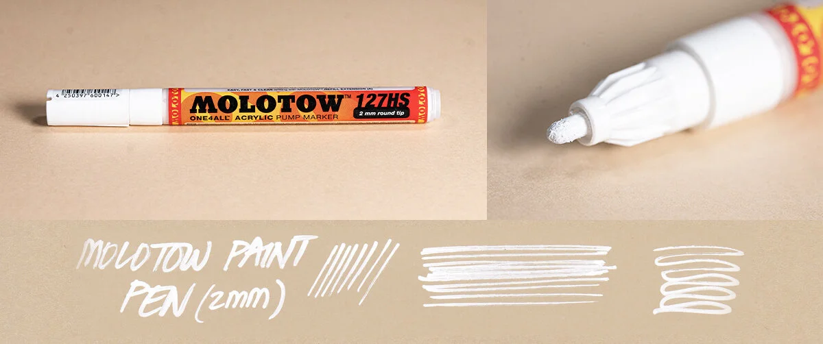 The Molotow Acrylic Pump Marker is another opaque paint pen that that, when it works, simply pops and lays down phat nice opaque white lines. I haven’t had a chance to try other variants yet, but there are a variety of tip sizes available as well.