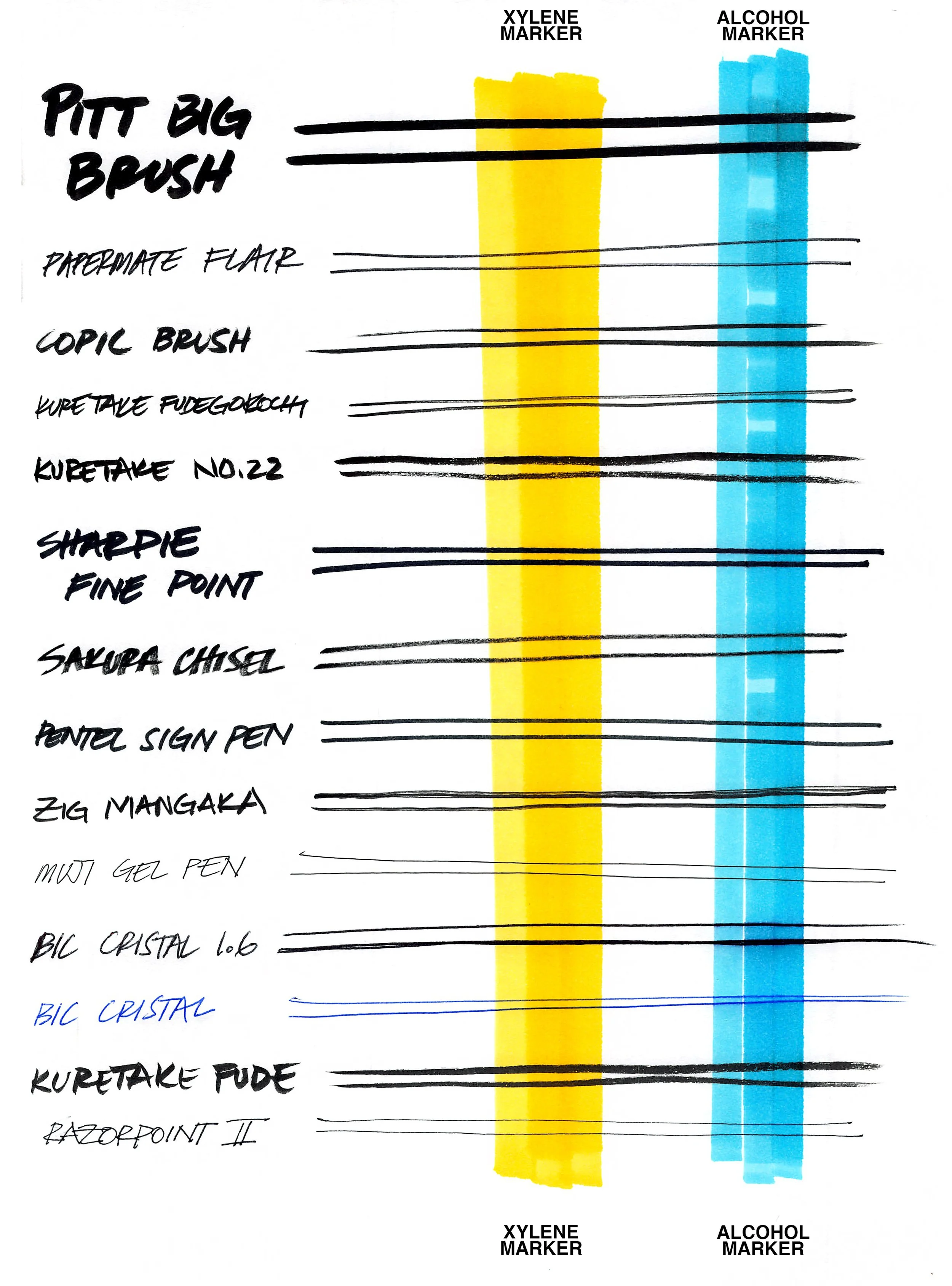 For pens, I recommend a felt pen that doesn’t bleed with marker application. My go-to is a Papermate Flair, however feel free to check out others mentioned here - https://www.sketch-a-day.com/pens